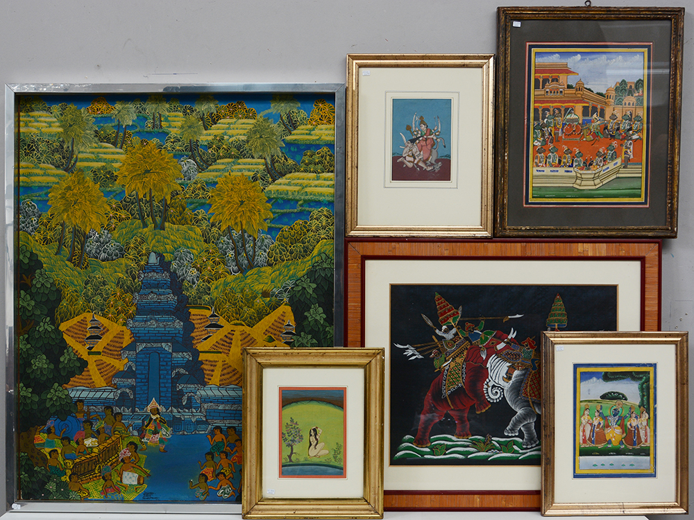 Sei opere su tela, carta e tessuto di manifattura indiana con figure e paesaggi, in cornice (lievi difetti) (max 69x89 cm.) -EN .