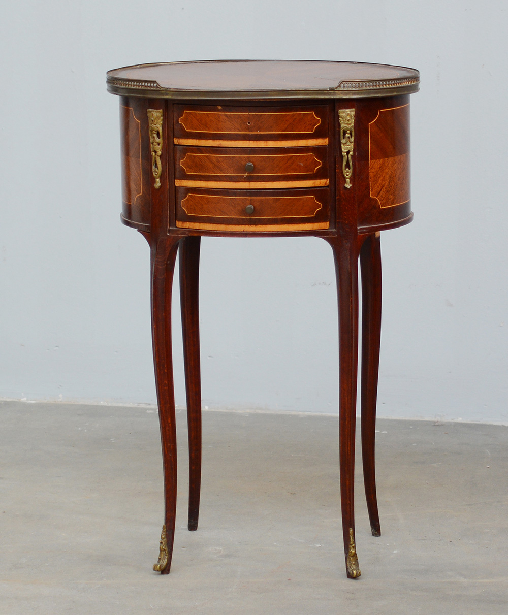 Mobiletto ovale in legno filettato con tre cassettini, ringhiera sul piano e piccole guarnizioni in metallo (cm 43x69x32) (lievi difetti)