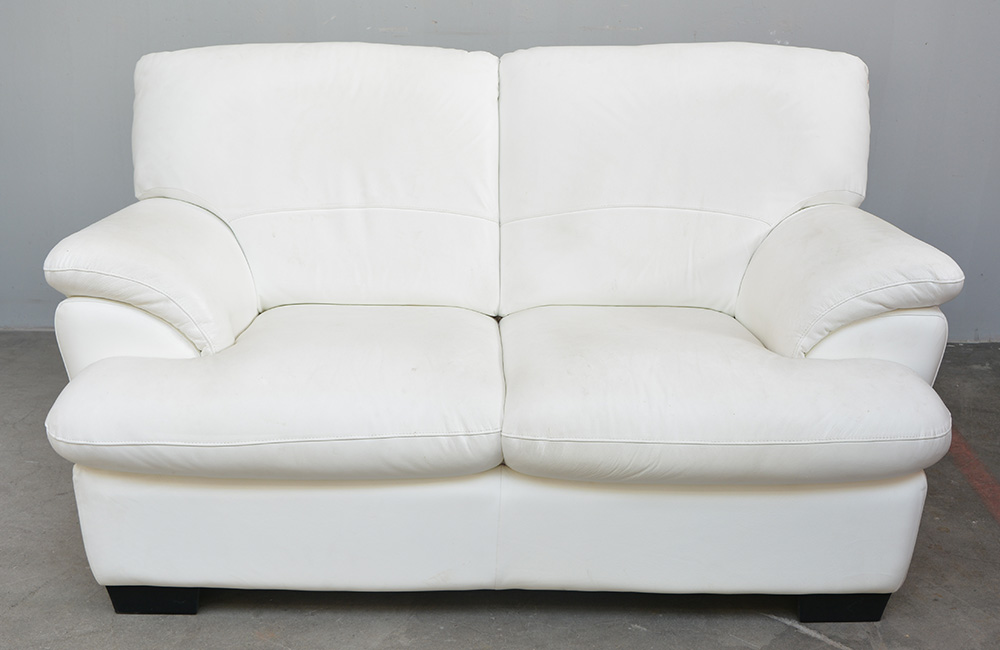 Divano imbottito a due posti rivestito in pelle bianca. Produzione recente...