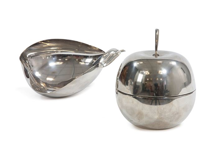 Mela e pera, due contenitori in lega Christofle argentata.