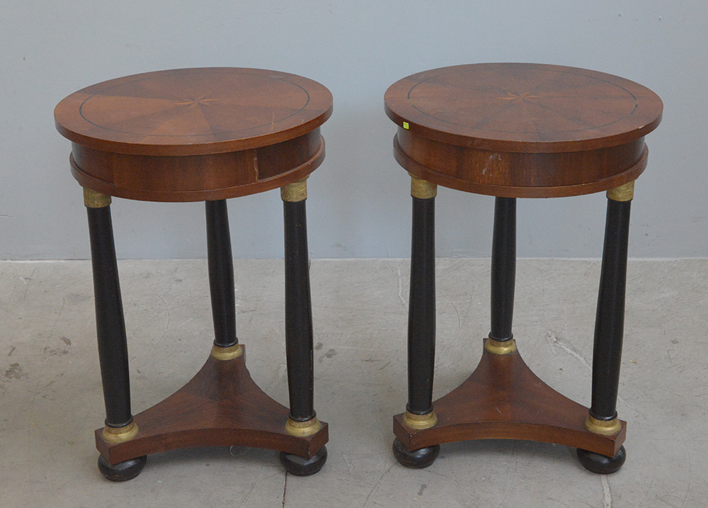 Coppia di tavolini in "stile impero" con piano tondo intarsiato e tre...