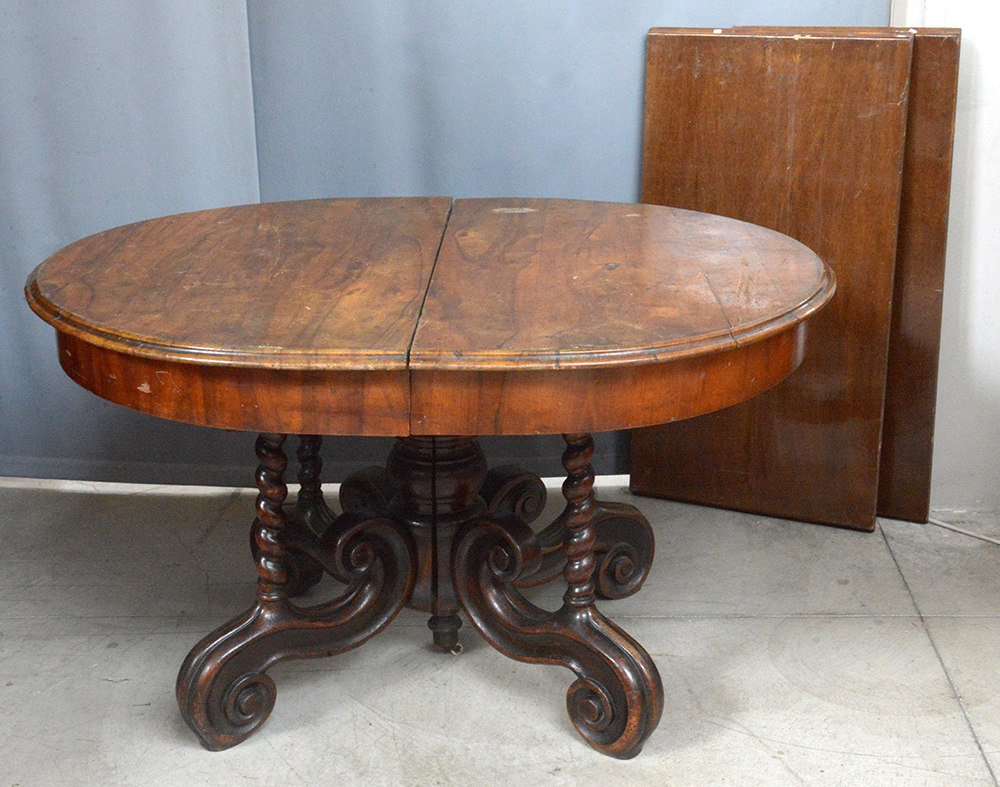 Tavolo da centro allungabile in noce con sostegno centrale tornito, colonnine tortili e quattro piedi scolpiti e sagomati, munito di due prolunghe. Secolo XIX (cm 142x80x113) (difetti)