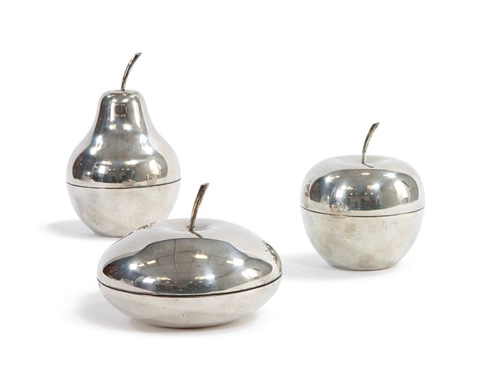 Mela, pera e ciliegia, set di tre contenitori in lega Christofle argentata.