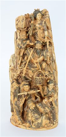 Scultura in avorio raffiguranti immortali taoisti e servitori, firmato (difetti) Cina, sec. XX (h. 33 cm.) -EN .