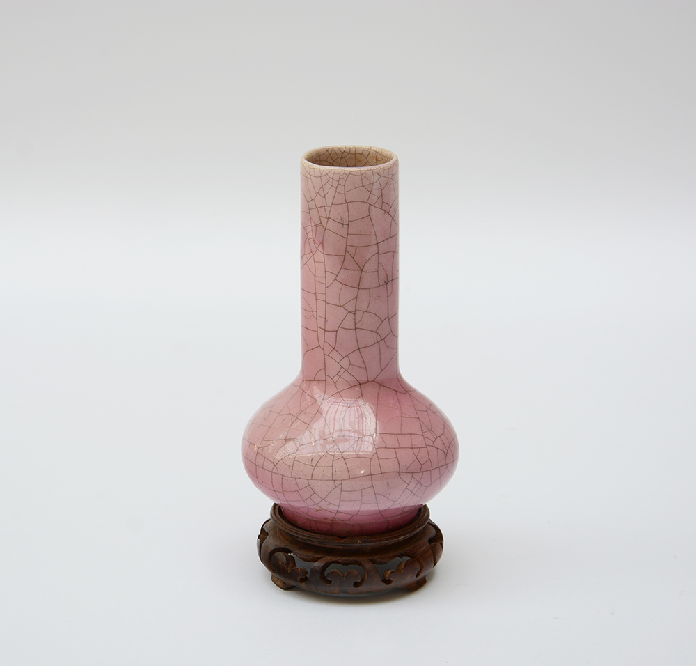 Vaso dal corpo schiacciato e dal lungo collo con invetriatura rosa con craquelure (lievi difetti) Cina, sec. XX?(h. 16 cm.) -EN .