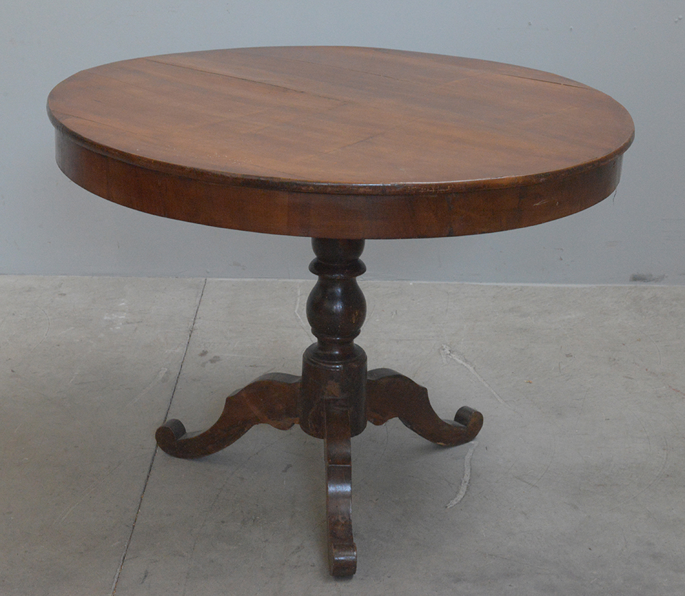 Tavolino da centro in noce con piano tondo, gamba centrale tornita e tre piedi a sagoma. Sec. XIX (d cm 98 e h cm 72)(difetti)