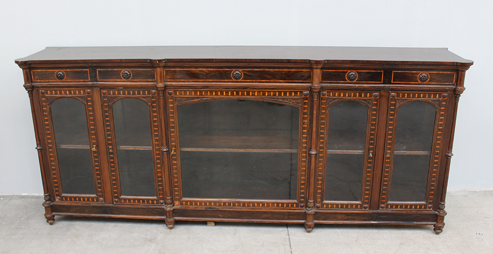 Mobile vetrina in legno a tinta scura intarsiato e filettato con cinque ante divise da colonnine e decorato da fioroni intagliati (cm 240x102x45) (lievi difetti)