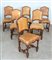Gruppo di sei sedie con schienale sagomato, gambe e traverse tornite a rocchetto rivestite in pelle. Secolo XVIII (difetti e restauri)
