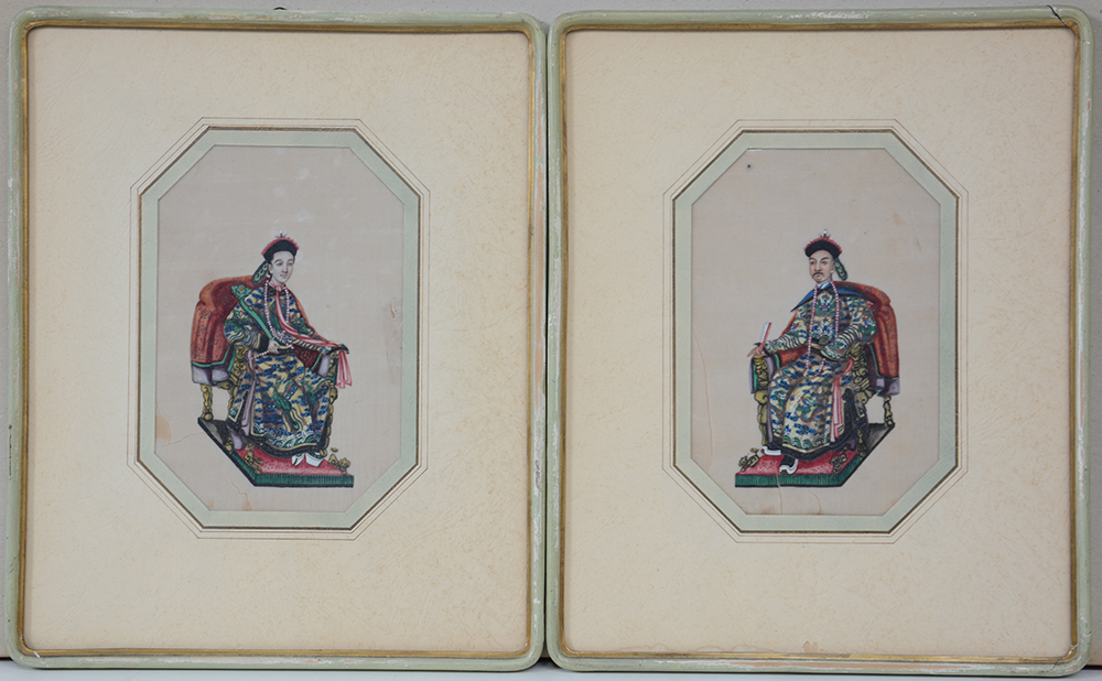 Coppia di dipinti su carta di riso raffiguranti imperatore ed imperatrice su troni (difetti) Cina, sec. XIX (21x14 cm.) -EN .