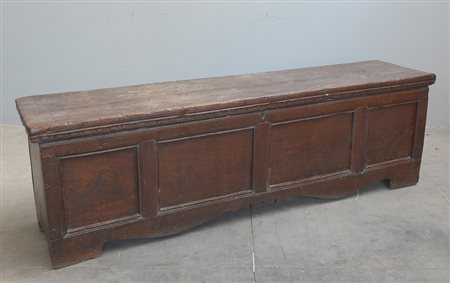 Cassapanca in rovere con fronte decorato a riquadri, sec. XVII (cm 206x63x49) (difetti)