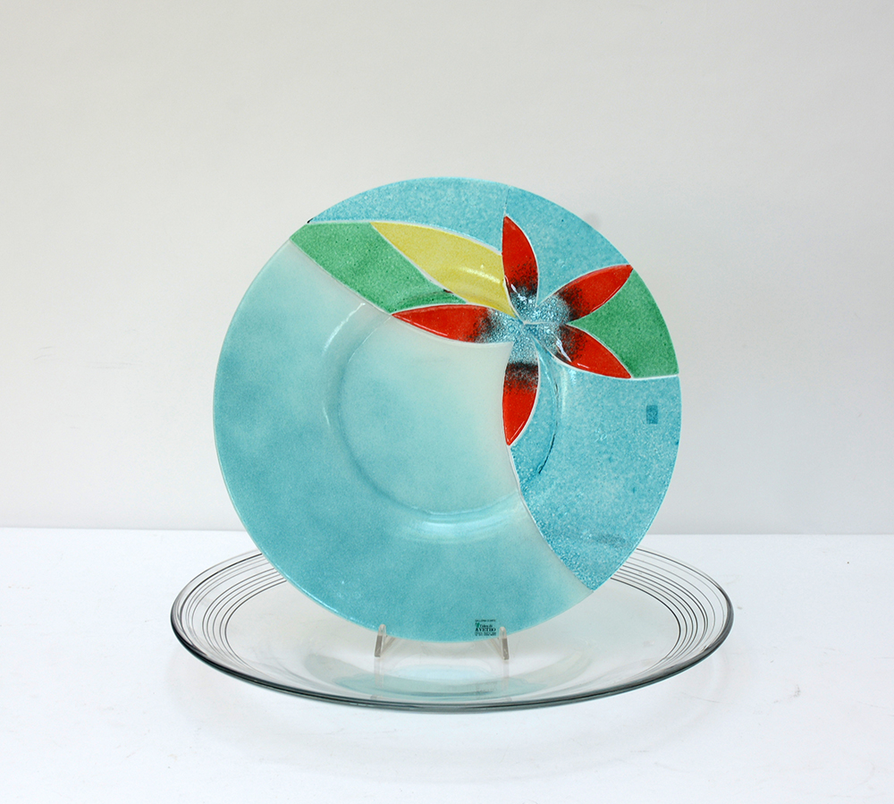 Lotto di due centrotavola in vetro di decoro e fatture differenti (d max cm 47)
