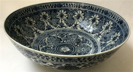 Grande ciotola in porcellana bianca e blu decorata con fiori di loto all'esterno e motivi geometrici all'interno in stile Ming (difetti) Cina, sec. XX (d. 40 cm.)
