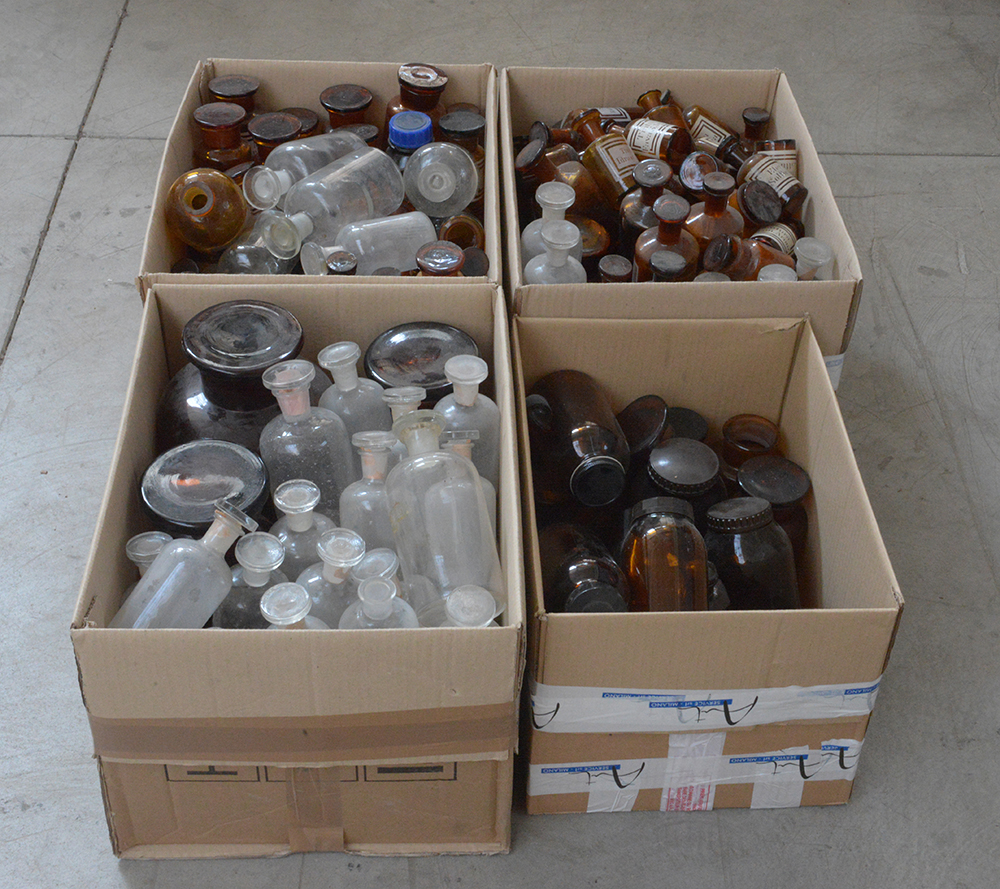 Lotto composto da numerose bottiglie e flaconi da farmacia in vetro per lo...