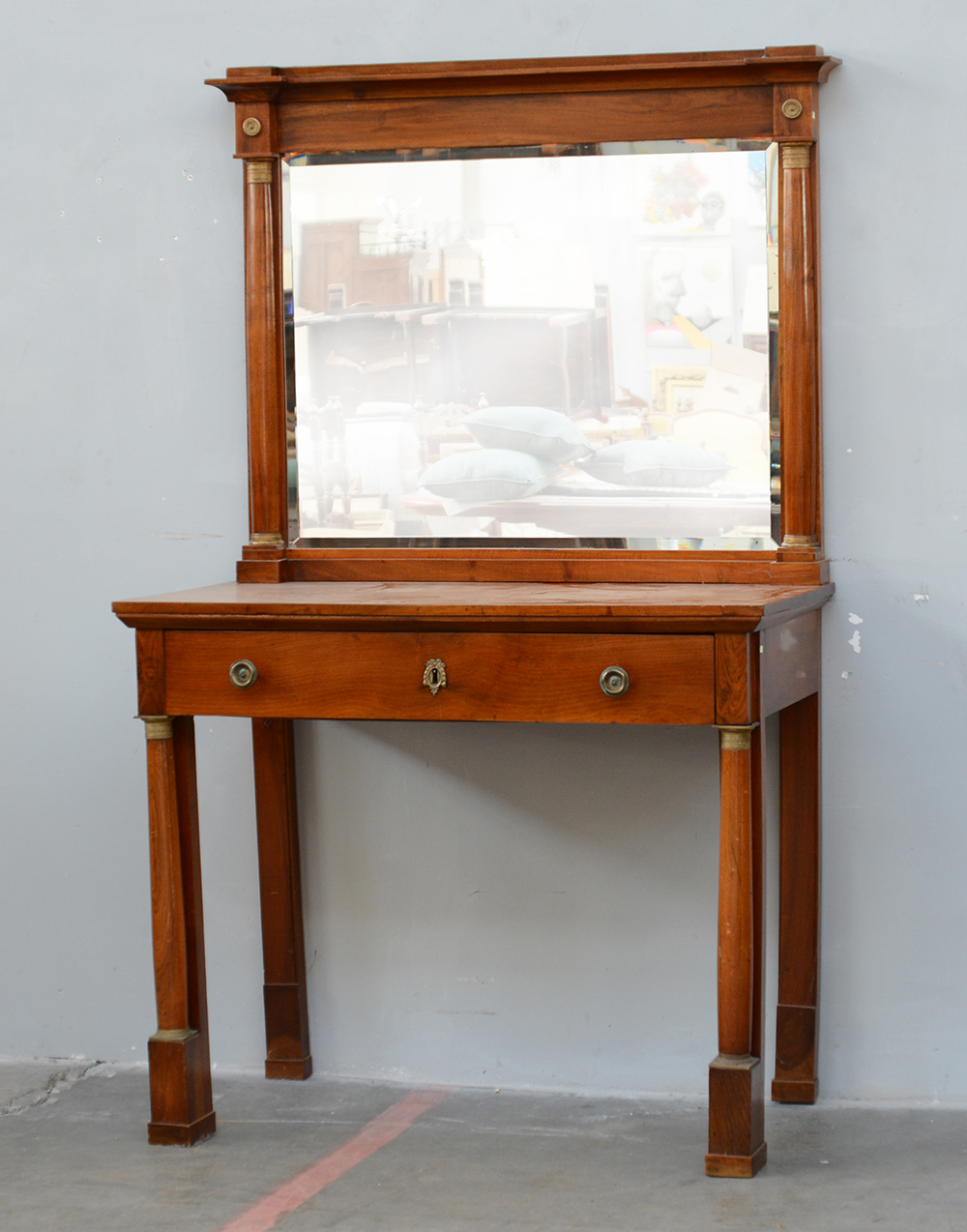Consolle con specchiera in noce ad un cassetto nella fascia. Montanti decorati con colonne e capitelli in ottone dorato, fine sec. XIX (cm 110x180x58)
