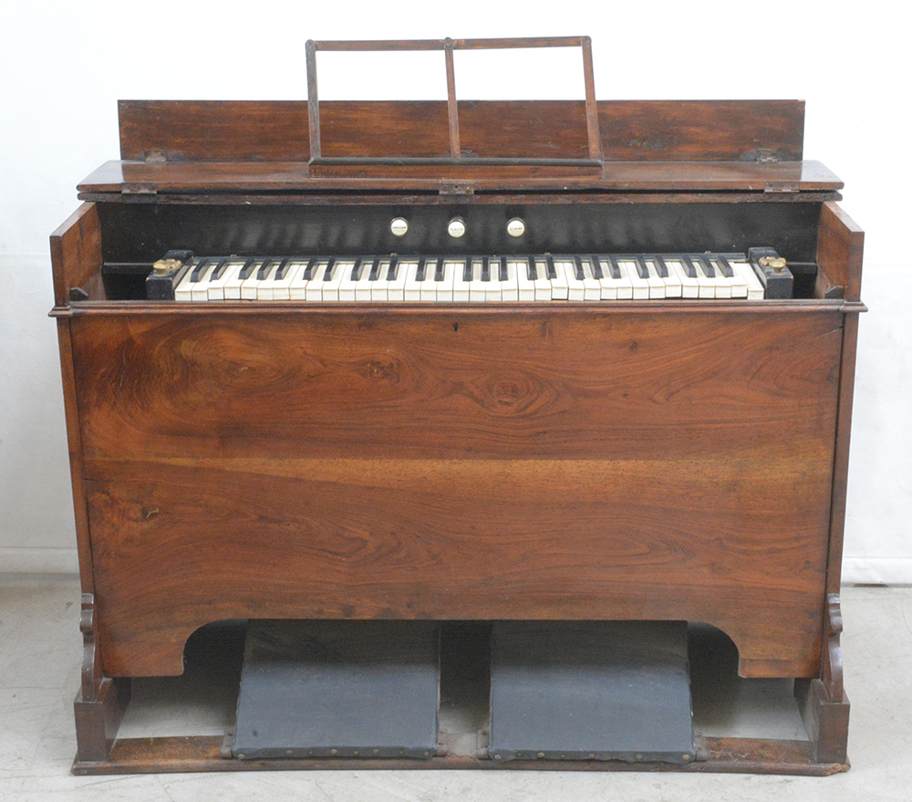Armonium con struttura in noce, tastiera ebanizzata con portacandele laterali. Iscritto "Massa don Gioachino Lozio 1903" sotto la tastiera (cm 115x83x57) (difetti)