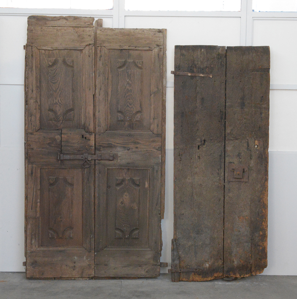 Lotto di tre antiche ante in legno con serrature e cerniere in ferro, misure differenti (difetti)