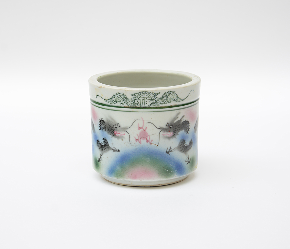 Portafiori cilindrico in porcellana policroma decorato con draghi (lievi...