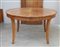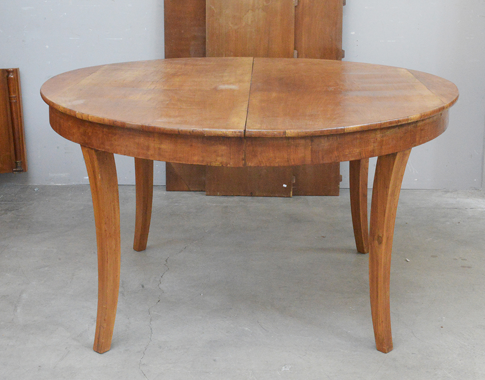 Tavolo da centro allungabile con piano circolare in mogano e quattro gambe a sciabola, munito di tre prolunghe (d cm 147, h cm 80)