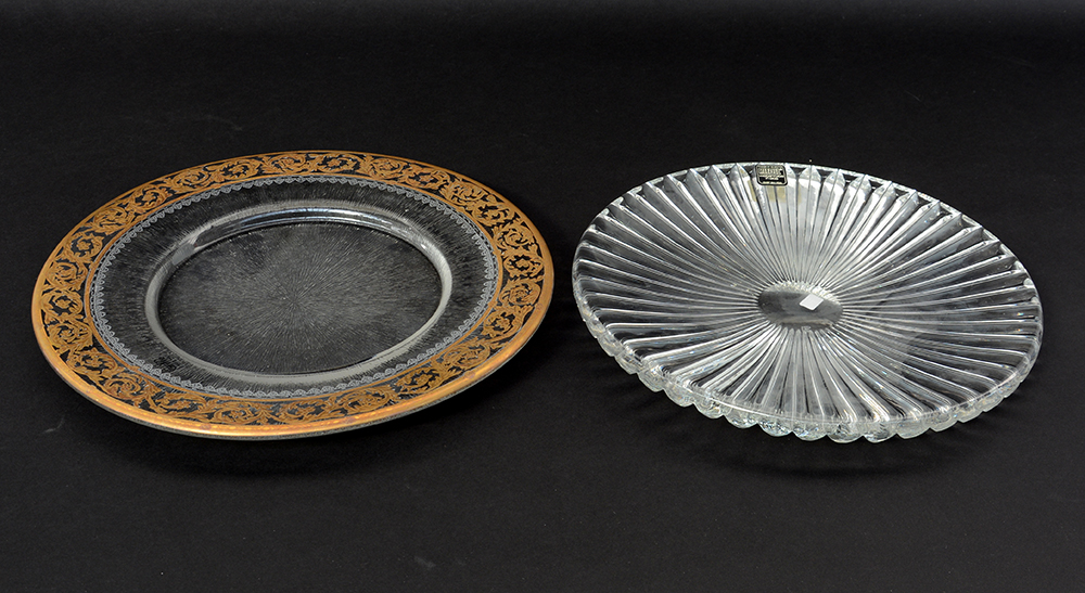 Lotto di due piatti in cristallo, uno costolato marcato Riedel, Austria, l'altro di manifattura italiana con tesa a decoro dorato (d max cm 32,5) (lievi difetti)