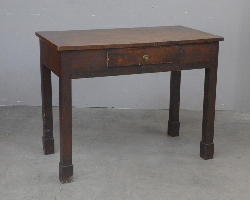 Piccolo scrittoio in noce con cassetto nella fascia e quattro gambe squadrate con terminale a "dado" (cm 134x80x54) (difetti)