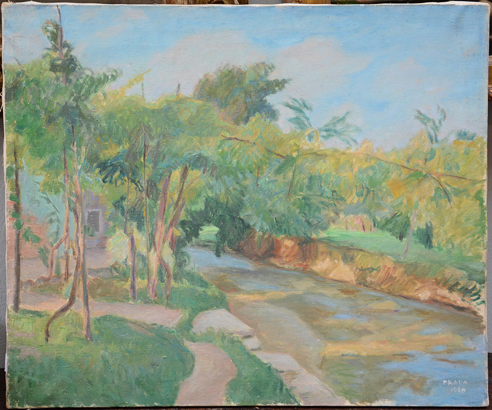 Carlo Prada (Milano 1884 - Santa Margherita Ligure 1960) "Paesaggio con torrente" 1959, olio su tela (cm 50x59,5) Firmato e datato in basso a destra