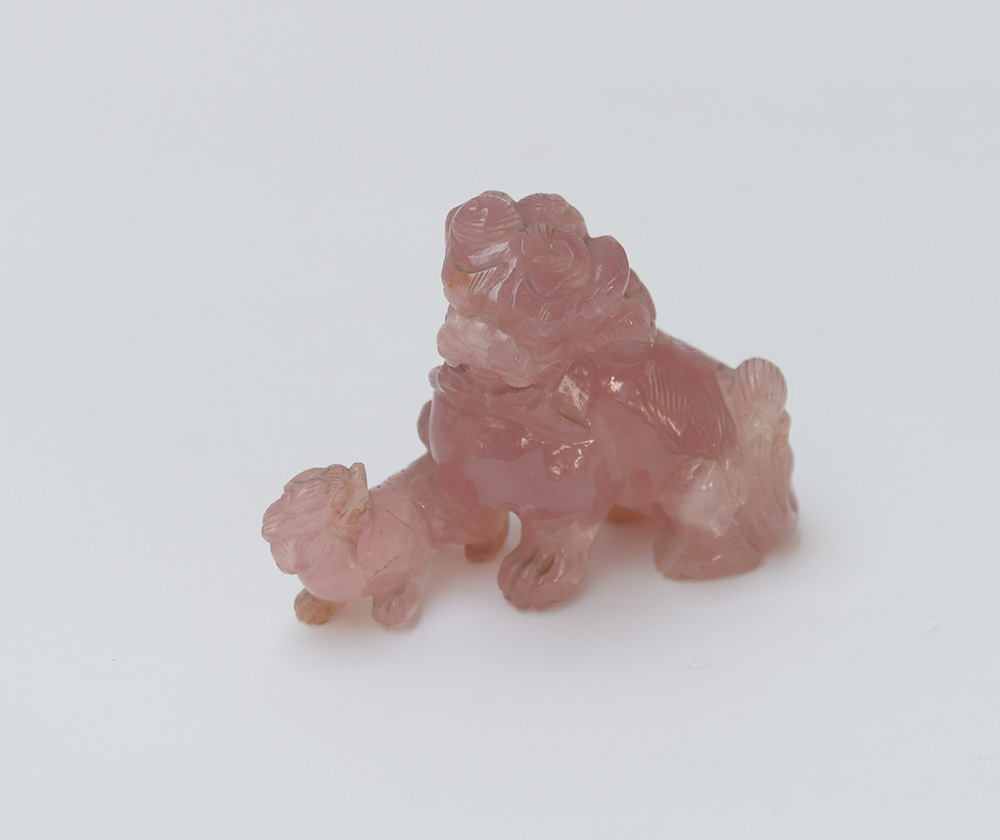 Scultura in quarzo rosa raffigurante un leone con cucciolo (lievi difetti) Cina, secolo XX (h. 11 cm.)