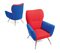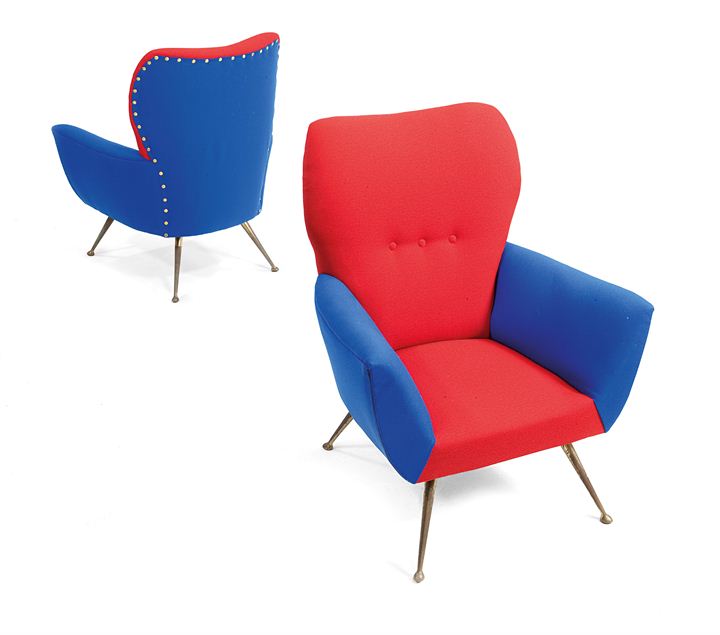 POLTRONE Coppia di poltrone rivestite in tessuto bicolore, piedi in fusione...
