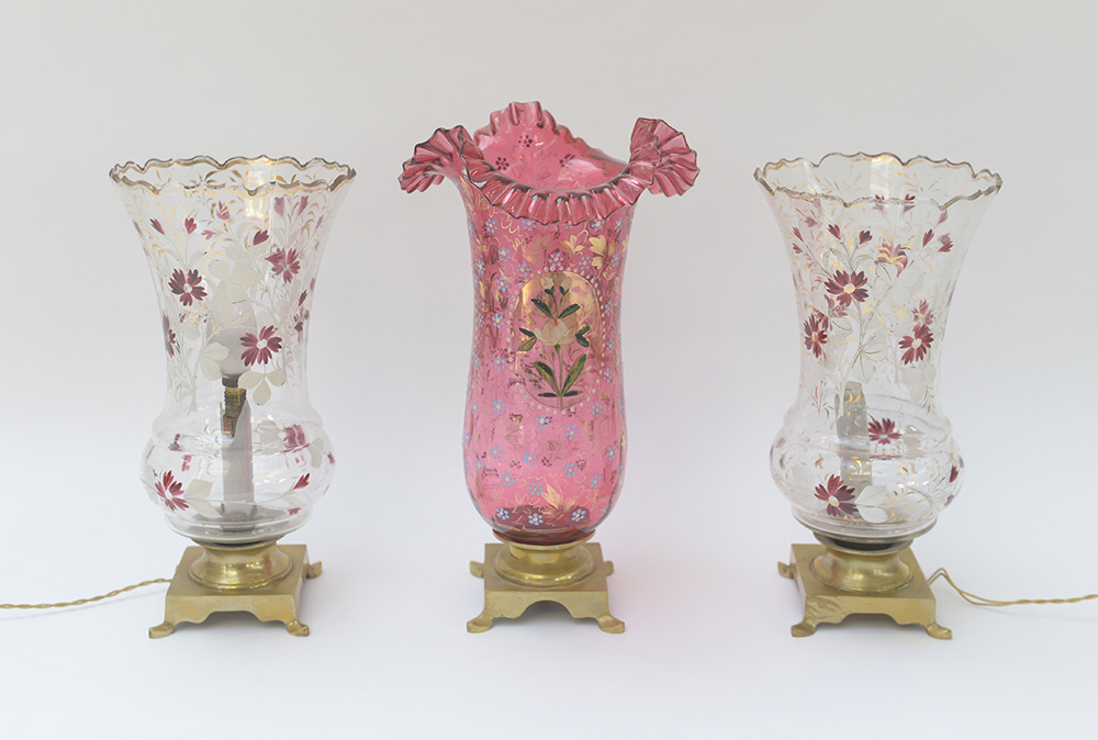 Lotto di tre lampade da tavolo, due montate a luce elettrica ed uno per candela, paralumi in vetro dipinto su base in bronzo (h max cm 36) (difetti)