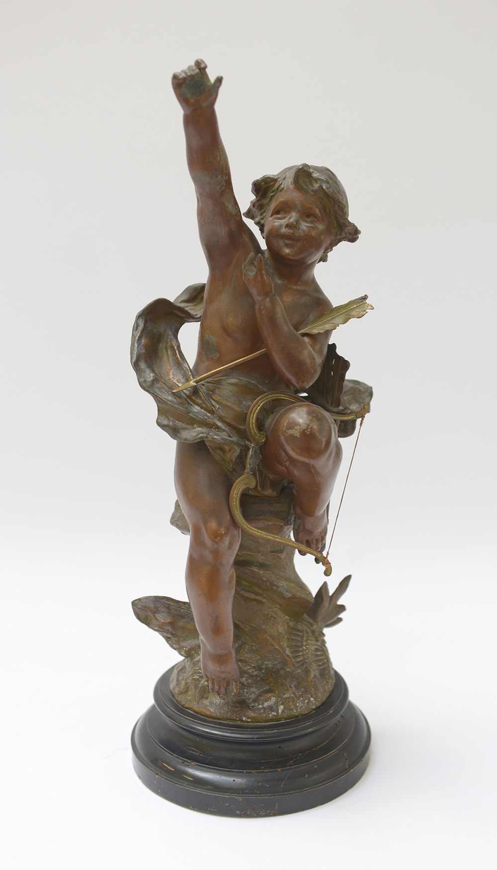 Scultura in metallo patinato raffigurante Cupido, base in legno (h tot cm 57) (difetti) -EN Scultura in metallo raffigurante un putto.