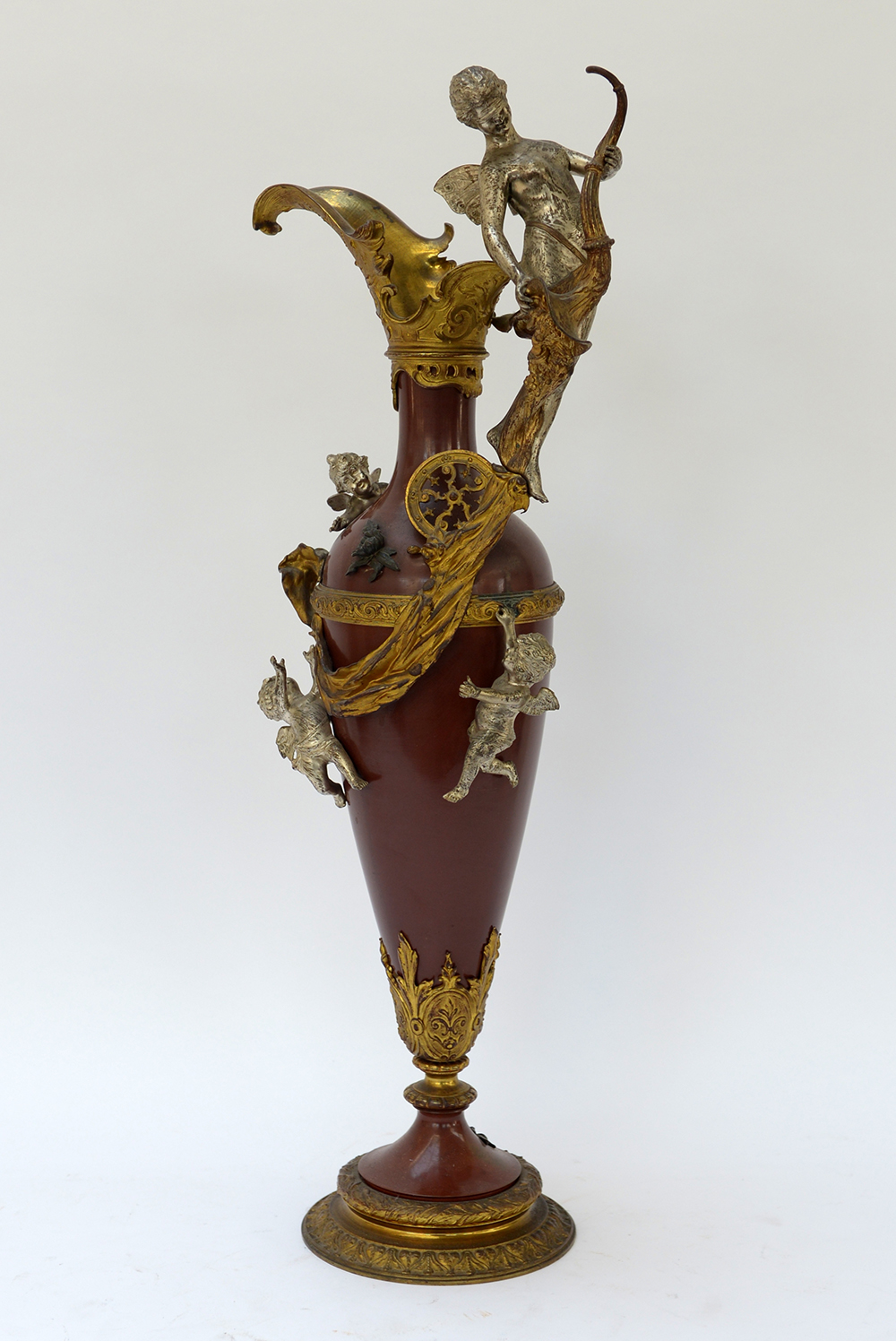 Grande brocca decorativa in metallo con guarnizioni a volute e figure a tuttotondo in metallo argentato e dorato (h cm 68) (difetti) -EN Brocca in metallo.