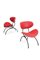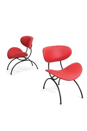 Coppia di poltrone con sedile e schienale in compensato curvato imbottito e rivestito in pelle rossa.