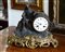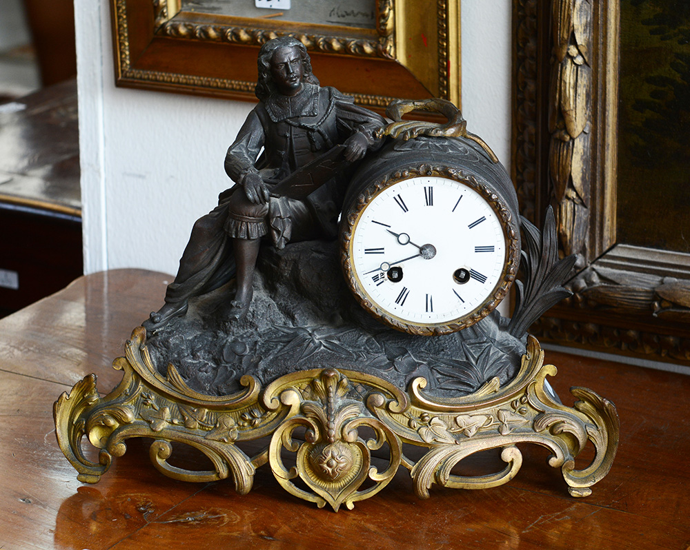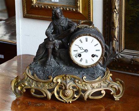 Pendola da tavolo in metallo decorata con figura di gentiluomo a tutto tondo,...