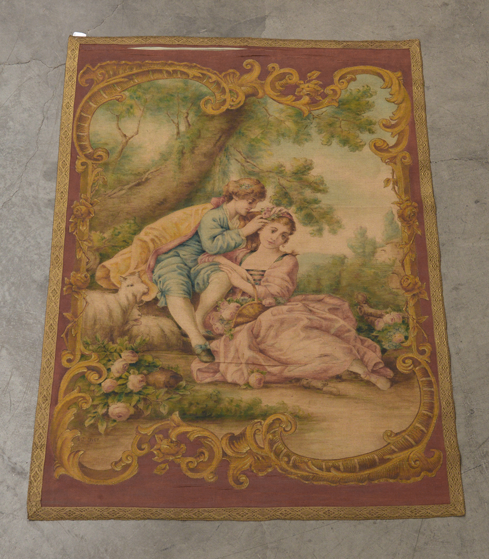 Arazzo, succo d'erba dipinto su tela con scena galante bucolica con...
