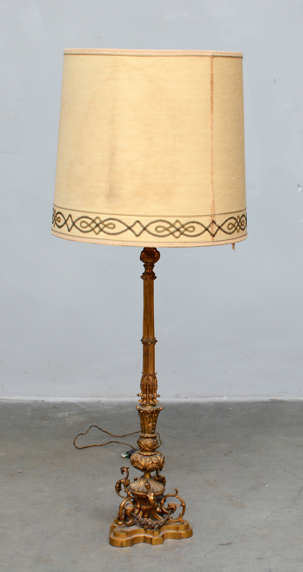 Lampada da tavolo in bronzo dorato decorata con foglie e volute (h lampada cm 89) (difetti)