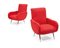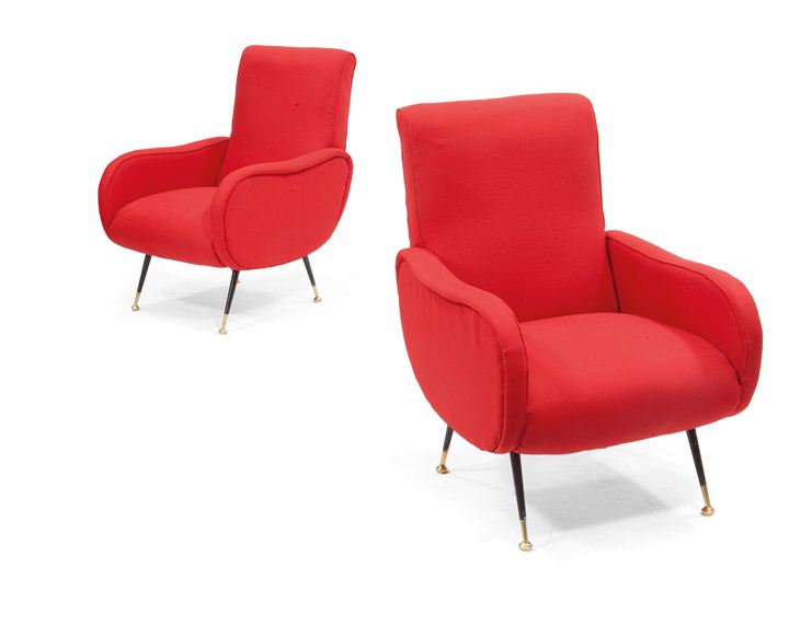 Coppia di poltrone rivestite in tessuto rosso, piedi con puntali in ottone.