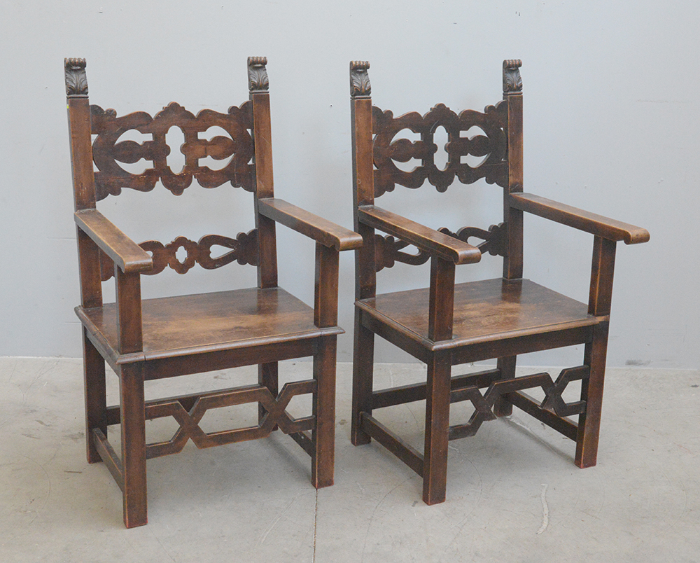 Coppia di poltrone in noce, in stile rinascimentale (difetti e mancanze)