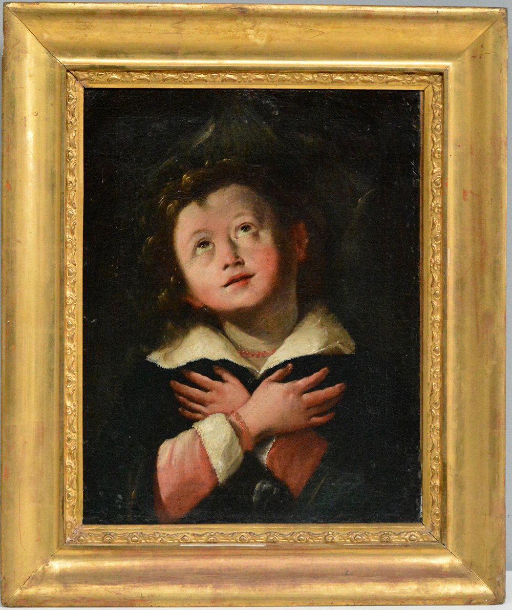 Ignoto, "Ritratto di fanciulla in estasi" olio su tela (cm 39,5x31) in cornice del secolo XIX (difetti e restauri)