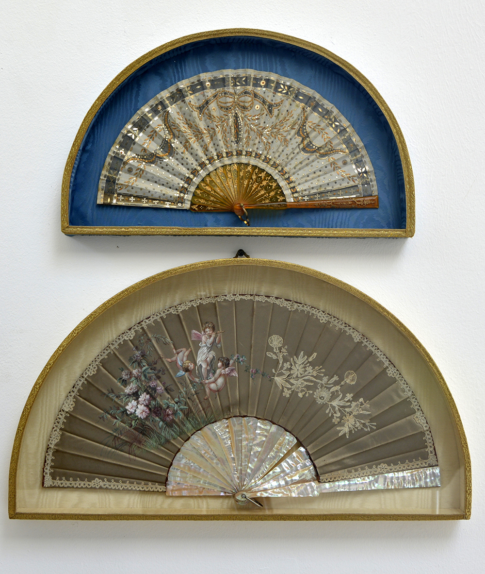 Lotto composto da due ventagli con decori diversi, contenuti in teca