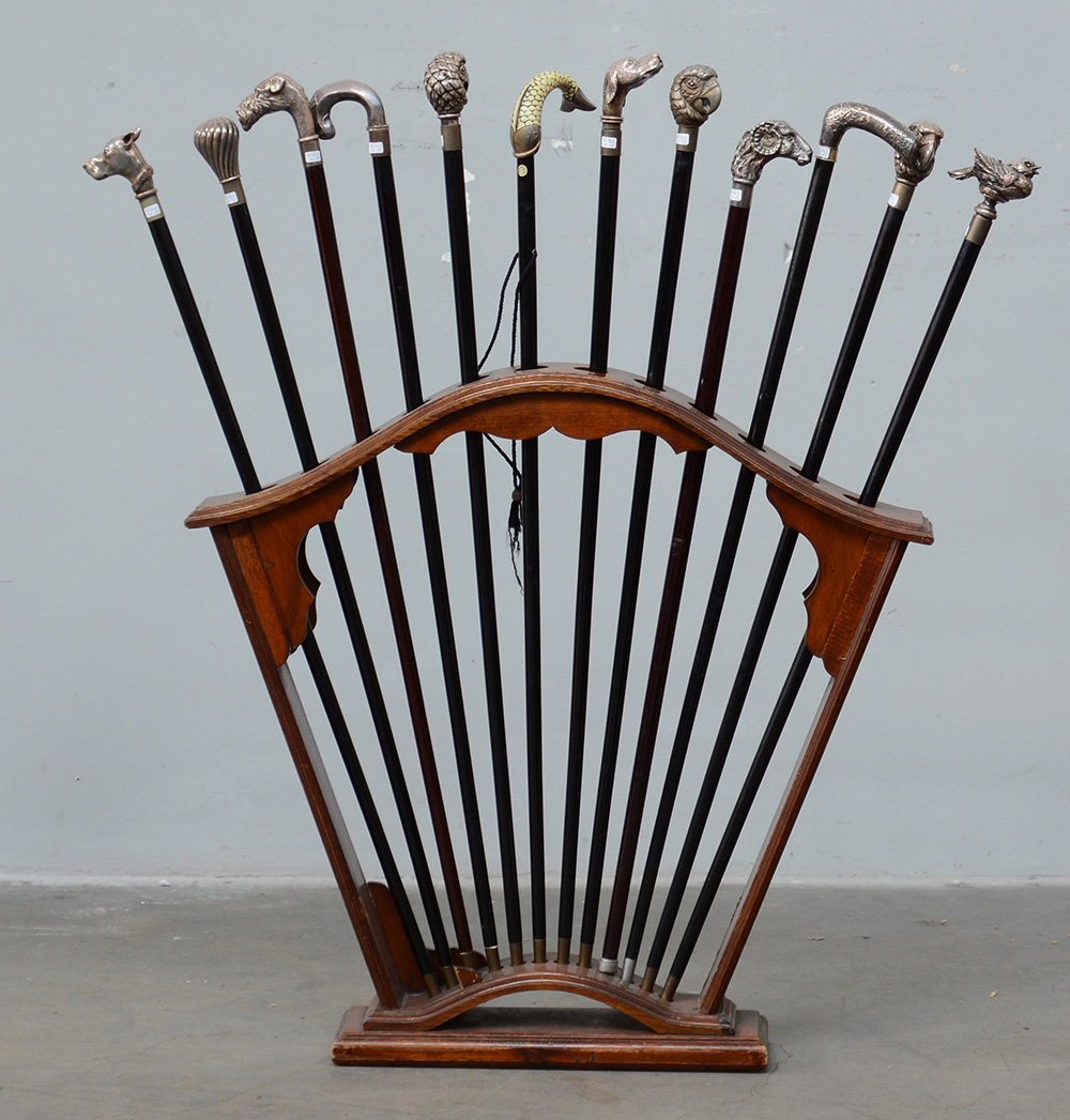 Portabastoni contenente un gruppo di dodici bastoni da passeggio con manici in metallo argentato (lievi difetti)