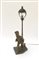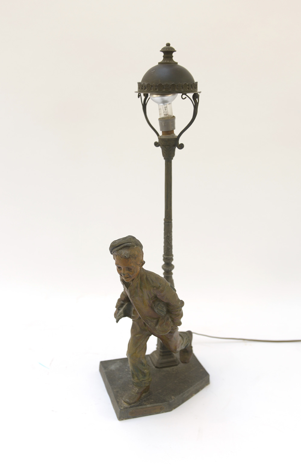Lampada da tavolo con scultura raffigurante uno ragazzo sotto un lampione in metallo brunito, firmata alla base. Francia, prima metà del secolo XX (h cm 65) (difetti)
