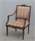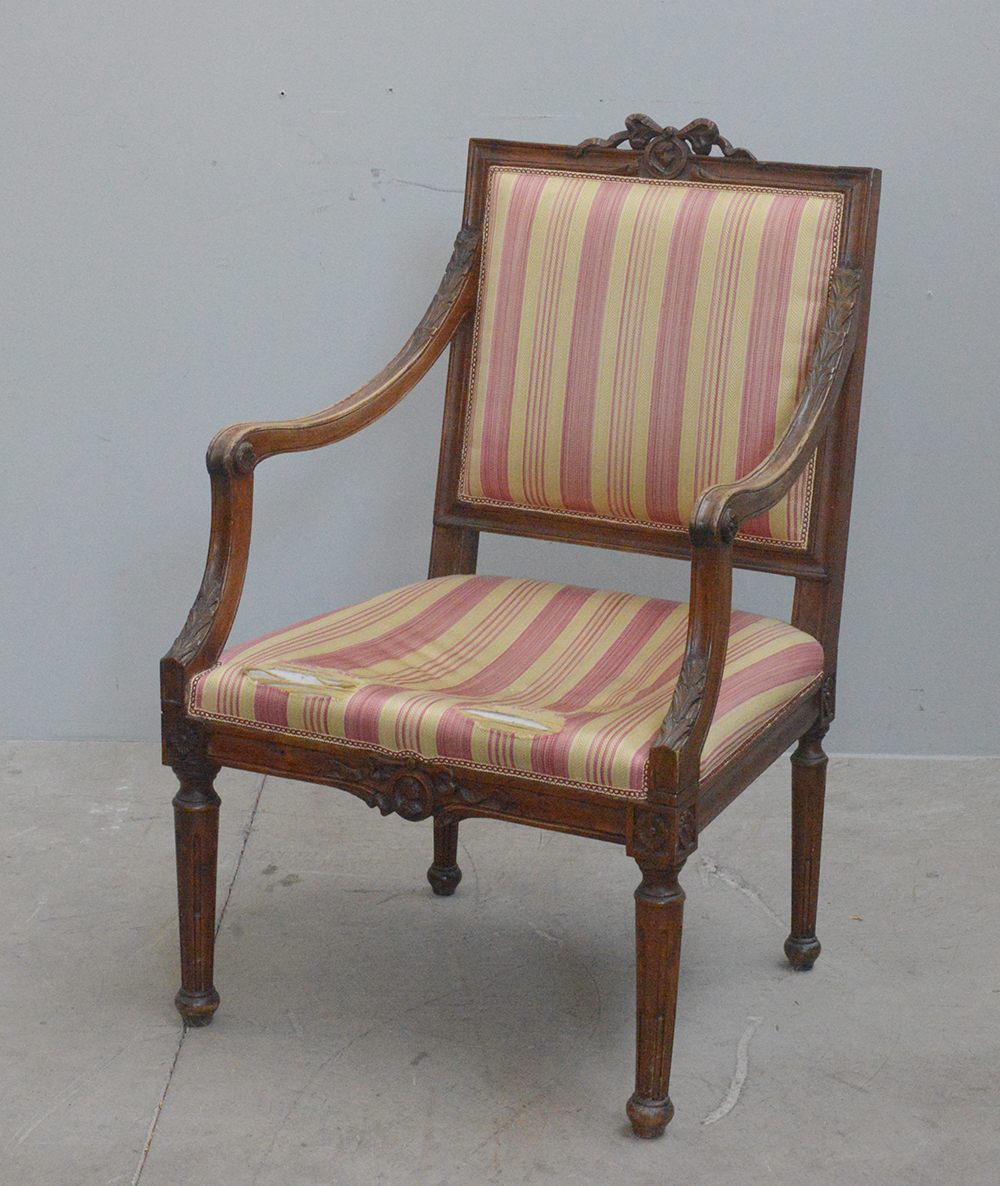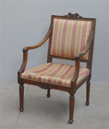 Poltrona in noce con braccioli ricurvi e cimasa intagliata a nastro e...