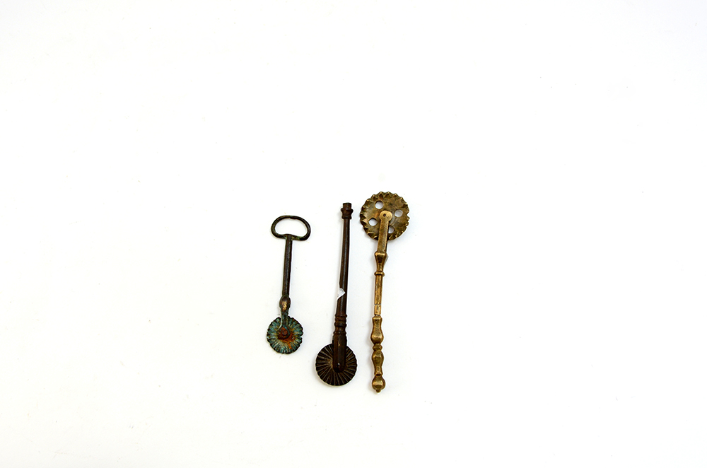 Lotto composto da tre rondelle da pasta in ottone/bronzo (Landini pp. 99/105; Finlay pp. 12/22/23) -EN Three brass/bronze pastry jiggers (Landini pp. 99/105; Finlay pp. 12/22/23)