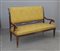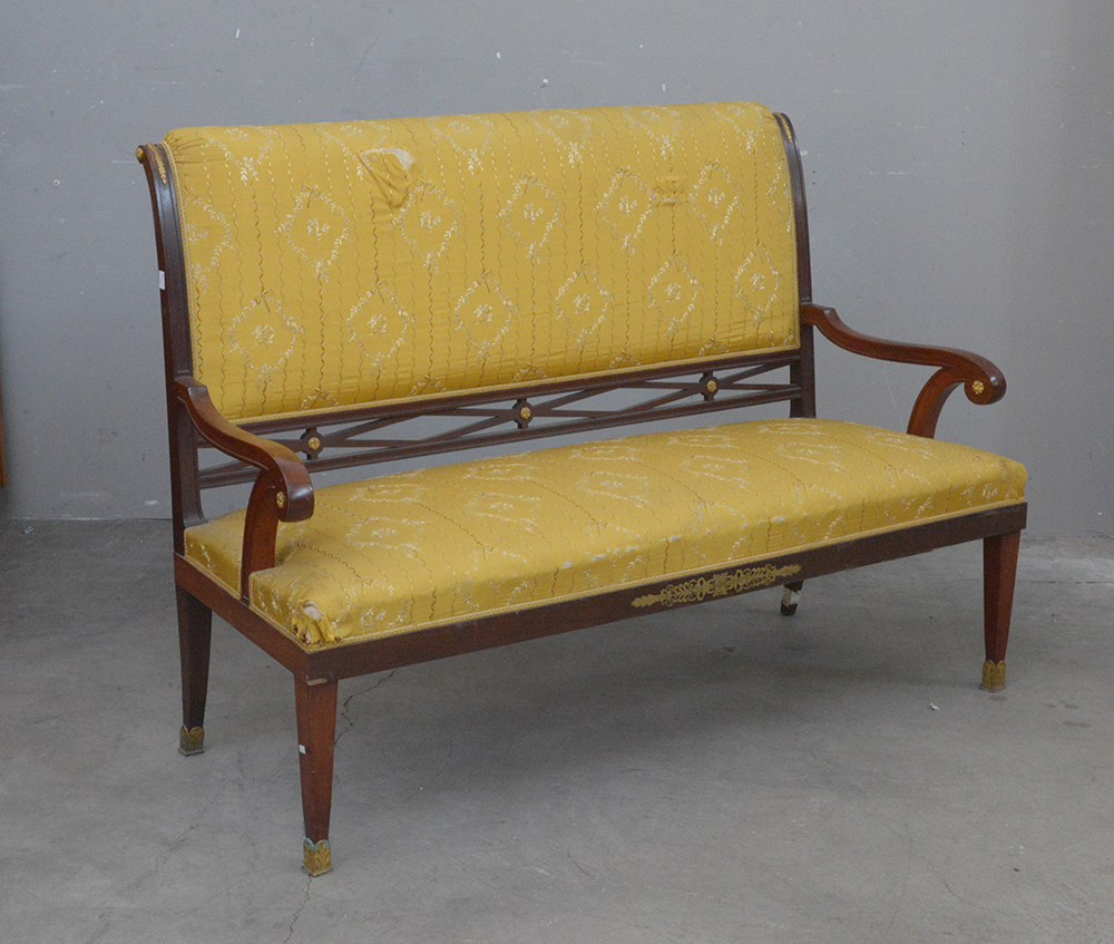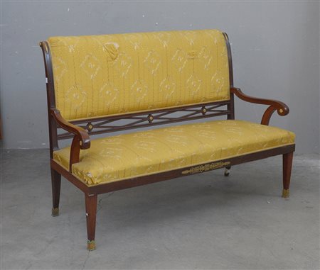 Divanetto in mogano decorato con applicazioni dorate, bracciolo a ricciolo e gambe rastremate (difetti)