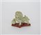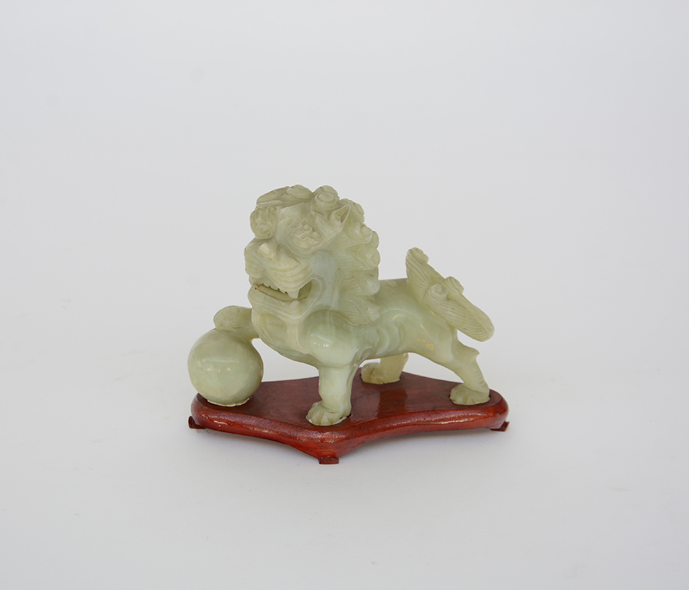 Scultura in pietra dura raffigurante leone con palla, base in legno (difetti) Cina, sec. XX (h. 11 cm.)
