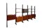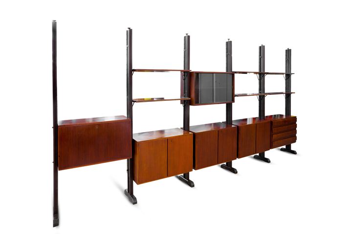Libreria modulare con sei montanti regolabili in altezza. Legno finto palissandro con piedini regolabili in ottone.