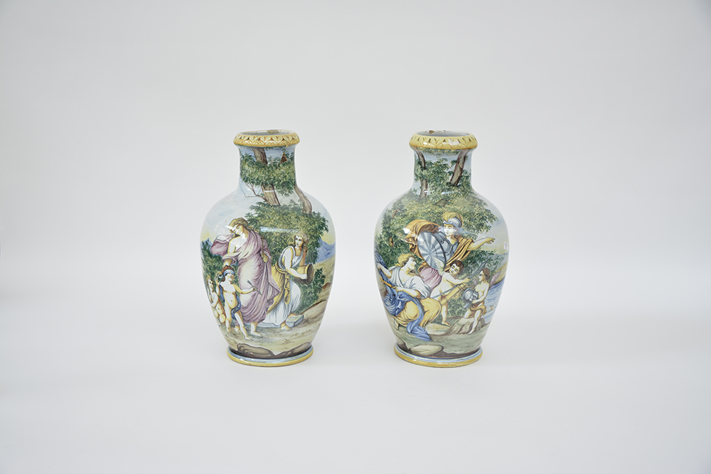 Coppia di vasi in maiolica decorati in policromia a scene classiche in paesaggi. Italia sec. XX (difetti e restauri)