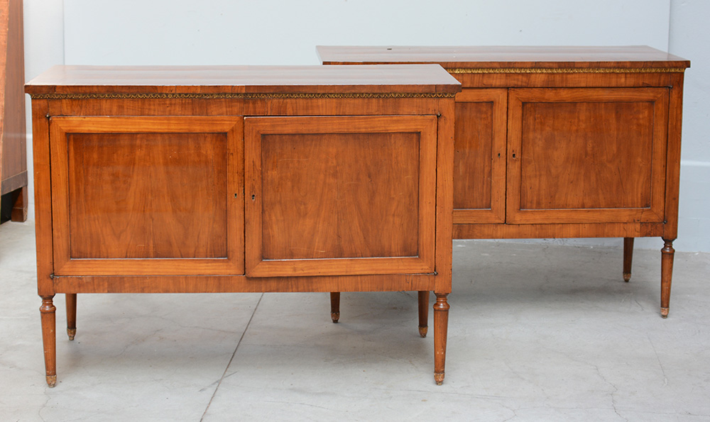 Coppia di credenzine lastronate in noce a due ante riquadrate, piedi torniti con puntali intagliati e dorati. Secolo XIX (cm 120x88x55)(difetti)