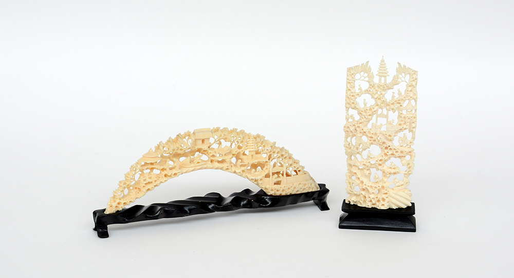 Scultura in avorio a forma di zanna con base in legno e schermo da tavolo in avorio, con base in legno (difetti)( l. max 17 cm.) Cina, sec. XX -EN .
