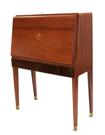 Sportello a ribalta sagomato, cassetto con fronte godronato, puntali in ottone. Interno rivestito in specchio con illuminazione.