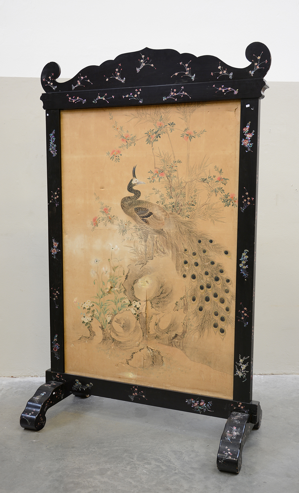 Pannello raffigurante pavone tra rami in fiore con cornice in legno laccato e decorato con madreperla (difetti) Giappone, sec. XX Evento ETRO "Dandy Detour".